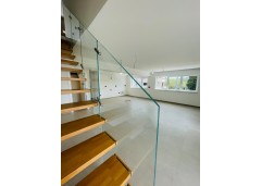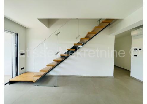Designed glass and wooden stairs lead to the second floor, where there are two more rooms, a bathroom, and a beautiful large balcony (12.5m2), also with views of the sea and the old town of Rovinj. One of the rooms has all the necessary connections, making it possible to create a separate kitchen upstairs for added privacy.