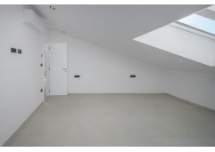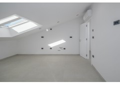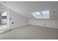 The apartment spans two floors, occupying the first floor and the attic. The spacious living room opens onto a large terrace of 25m2 with views of the sea and the old town of Rovinj. On the same floor, there are also two bedrooms, two bathrooms, and a storage room.